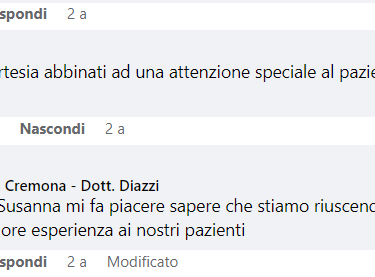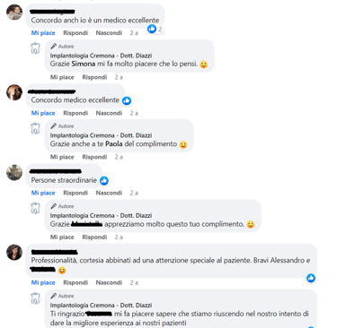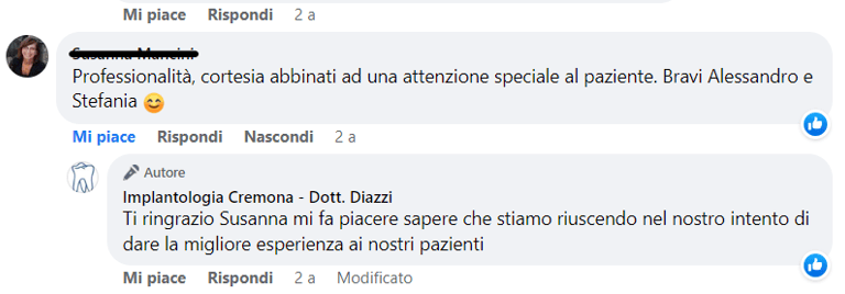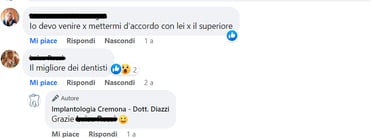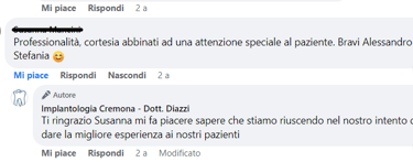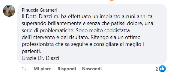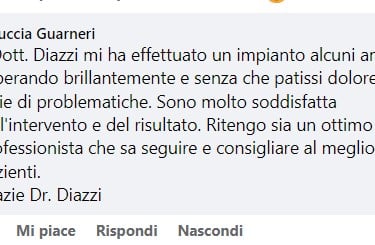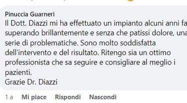 "Professionalità e serietà. E bravissima e gentilissima la tua assistente. Sono rimasta sorpresa dal risultato finale. Posso masticare come prima e dopo mesi non ho avuto problemi. Complimenti e grazie al Dott. Diazzi."