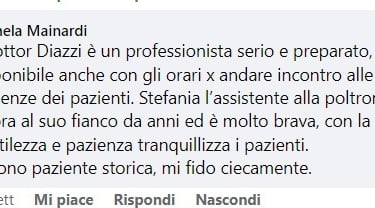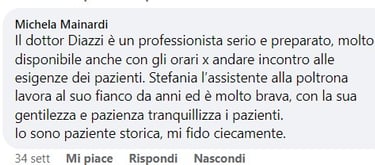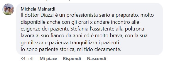 "Medico eccellente. Sono paziente dal dottor Diazzi ormai da anni e ha sempre svolto un ottimo lavoro senza che sentissi dolore. Prezzi onesti.